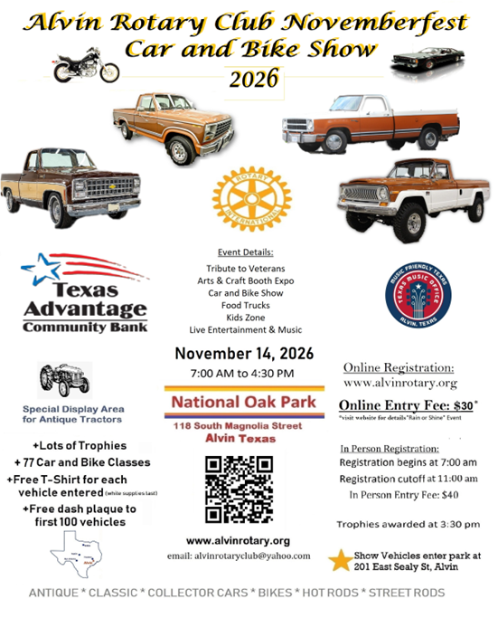Need not be present to win. CLICK HERE - PURCHASE TICKET ONLINE or get your Tickets from an Alvin Rotary Club Member. (Ticket Sales are Currently Closed to prepare for 2026 Drawing)