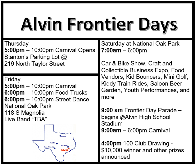 Saturday: Features the popular Frontier Day Parade through the old downtown area of Alvin, along with Arts and Craft Booths, Food Vendors, The $10,000 "Club 100" Drawing, and the Car & Bike Show. Saturday: we will be having a "saloon" beer garden open for adults 21 and up to sit, relax, play corn hole and other activities while listening to the bands. This area will be open from 10am-6pm