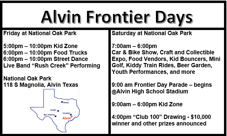 🌟 Alvin Rotary Club 2026 Car & Bike Show + Frontier Day April 24–25, 2026 • National Oak Park • Alvin, Texas Rev up your engines and roll into one of Alvin’s biggest traditions as the Alvin Rotary Club celebrates its 52nd Annual Frontier Day with the 2026 Car and Bike Show. The festivities begin Friday, April 24, and continue through a full day of family‑friendly fun on Saturday, April 25, all hosted at National Oak Park, 118 S. Magnolia Street.