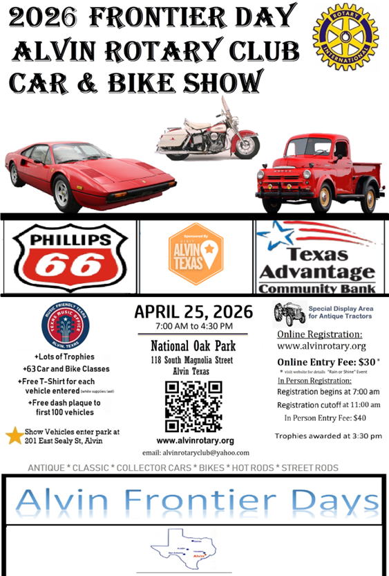 The First ticket drawn wins $2500 Gift Card, and the next-to last drawn wins a $2500 Gift Card. Other consolation prizes include $500 Gift Cards. So many opportunities to win! A contribution to the Alvin Rotary Club for $100 puts your entry in the drawing. Hurry, tickets are limited to the first one thousand entrees. Drawing will be held in Downtown Alvin on Saturday during Frontier Day.
