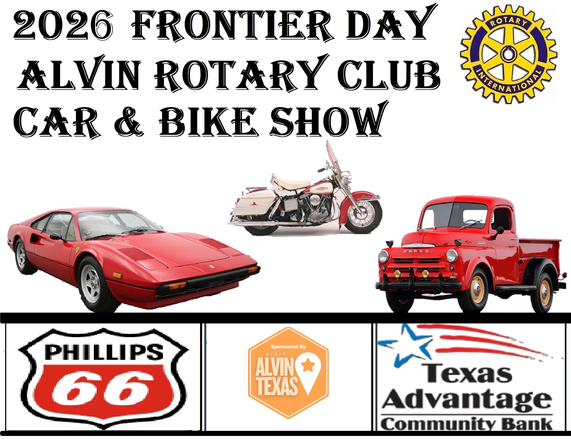 Rev up your engine at The Alvin Rotary Club 2026 Car and Bike Show event held April 25, 2026 for our 52nd Anniversary Frontier Day. Celebrations beginning April 24th - 25th. Hosted in the City of Alvin’s National Oak Park located at 118 S Magnolia Street, Alvin, Texas. Alvin is a great town on the south-side of Houston and just outside of Galveston. The combined event’s attractions include a kick-off barn dance, over 100 arts and craft booths, a parade, raffle, kid’s zone, food vendors, antique tractor display, live music, and youth performances. The car and bike show will run concurrent with other attractions and includes 77 class judging with over 130 plaques and trophies awarded. Get your RPM’s up with record breaking attendance for spectators at these events and entry into the park for spectators is FREE. The Alvin Rotary Club, made of 35 Rotarian club members, and Volunteers put on these community events. Proceeds from these family-friendly fun events go back directly to support the community. The Alvin Rotary has given back over $3 million dollars to local community and international projects.Friday: We will kick off the weekend with an old fashioned "Street Dance" Kick-off performances by a "Live Band" on Friday night from 6:00pm to 10:00pm! The dance will be held at National Oak Park, 118 S. Magnolia, Alvin, Texas. We will have food trucks, beer, live music, dancing and fun! We will have bounce houses for the kiddos! Rotarians will be selling our Club 100 raffle tickets also.